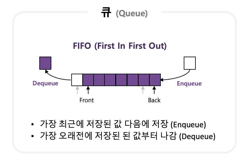 - 먼저 들어온 데이터가 먼저 나가는 형식(선입선출)의 자료구조이다.