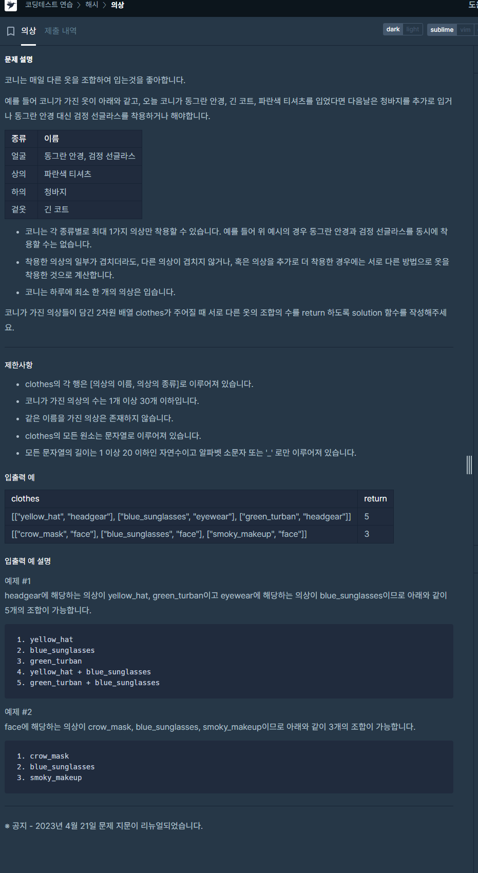 문제 사이트: https://school.programmers.co.kr/learn/courses/30/lessons/42578