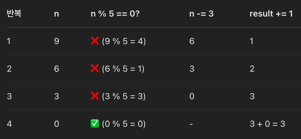 n -= 3 # 설탕이 5의 배수가 될때까지 반복