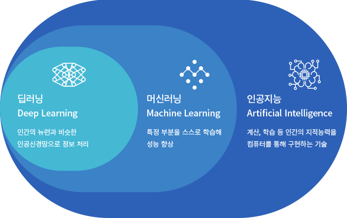 딥러닝(deep learning)은 더욱 고도화된 머신러닝 방법으로 사진과 같은 고차원 데이터에서 기계 스스로 패턴을 알아낼 수 있다는 장점이 있다. 예를 들면, 개와 고양이를 분류할 때 기존 머신러닝은 일반적으로 귀, 코, 입, 발 모양 등 개와 고양이를 구별할 수 있는 큰 특징을 뽑아 적은 수의 변수로 만들어 학습시키고, 딥러닝은 많은 픽셀로 구성된 개와 고양이 사진 자체를 학습시켜서 진행합니다.