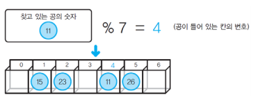 11을 7로 나눈 나머지는 4이므로 x[4]에 바로 저장한다. 이렇게 키를 해시값으로 변환하는 과정을 해시 함수(hash function)라고 한다. 또한 일반적으로 해시 함수는 나머지를 구하는 연산 또는 그 연산을 응용할 때 주로 사용한다. 해시 테이블에서 만들어진 원소를 버킷(bucket)이라고 한다.