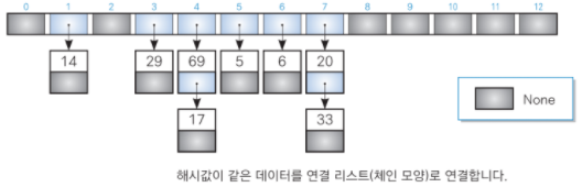 hash = ChainedHash(13) # 크기가 13인 해시 테이블을 생성