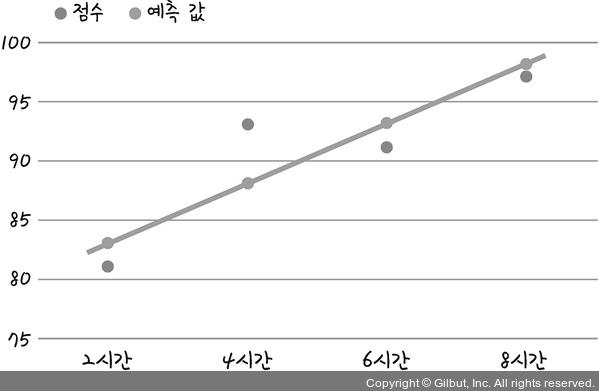 이 직선에 우리는 다른 x 값(공부한 시간)을 집어넣어서 '공부량에 따른 성적을 예측'할 수 있다.