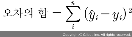 오차에 양수와 음수가 섞여 있어서 오차를 단순히 더해 버리면 합이 0이 될 수도 있다. 부호를 없애야 정확한 오차를 구할 수 있다.따라서 오차의 합을 구할 때는각 오차의 값을 제곱해 준다. 이를 식으로 표현하면 다음과 같다.