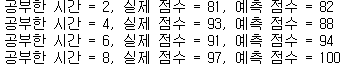 print("공부시간 = %.f, 실제 점수 = %.f, 예측 점수 = %.f" % (x[i], y[i], predict(x[i])))