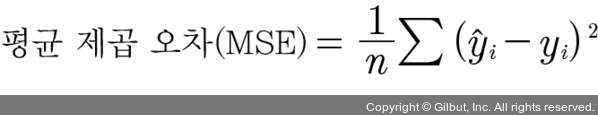 오차의 합에 이어 각 x 값의 평균 오차를 이용한다. 위에서 구한 값을 n으로 나누면 오차 합의 평균을 구할 수 있다. 이를 평균 제곱 오차(Mean Squared Error, MSE)라고 부른다.