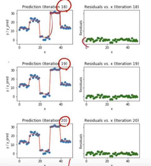 | 트리모델을 이용해서 데이터를 pick 한 것 | 첫번째 트리모델에서 y값과의 차이 첫번째 트리로 부터 나온 값에서 residual을 구한 값 |